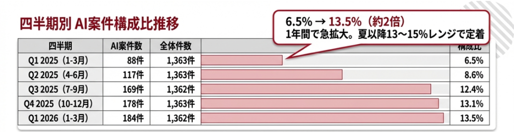 | 四半期 | AI案件数 | 全体件数 | AI構成比 | 前四半期比 |
